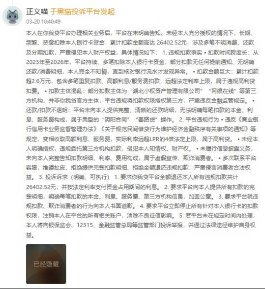 3月20日,一位你我贷平台用户投诉称,其在你我贷办理业务后,平台在未明确见告、未得回本东谈主充分授权的情况下,耐久、常常、坏心扣除本东谈主银行卡资金,自2023年至2026年累计扣款金额高达26402.52元,波及多笔不解铺张、还款及分期扣款。