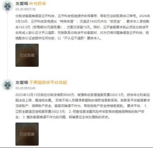 另有用户先后提交两起投诉及补充说彰着示,其于2025年12月15日借款8900元,被强制收取升值做事费2002.5元,笼统年化利率远超法定上限;同期存在严重信息走漏问题,有不解东谈主员精确掌抓其借款信息关连本东谈主,用户关连平台客服条件冻结账户、保险安全时,客服推诿不四肢,导致账户安全络续受防止。